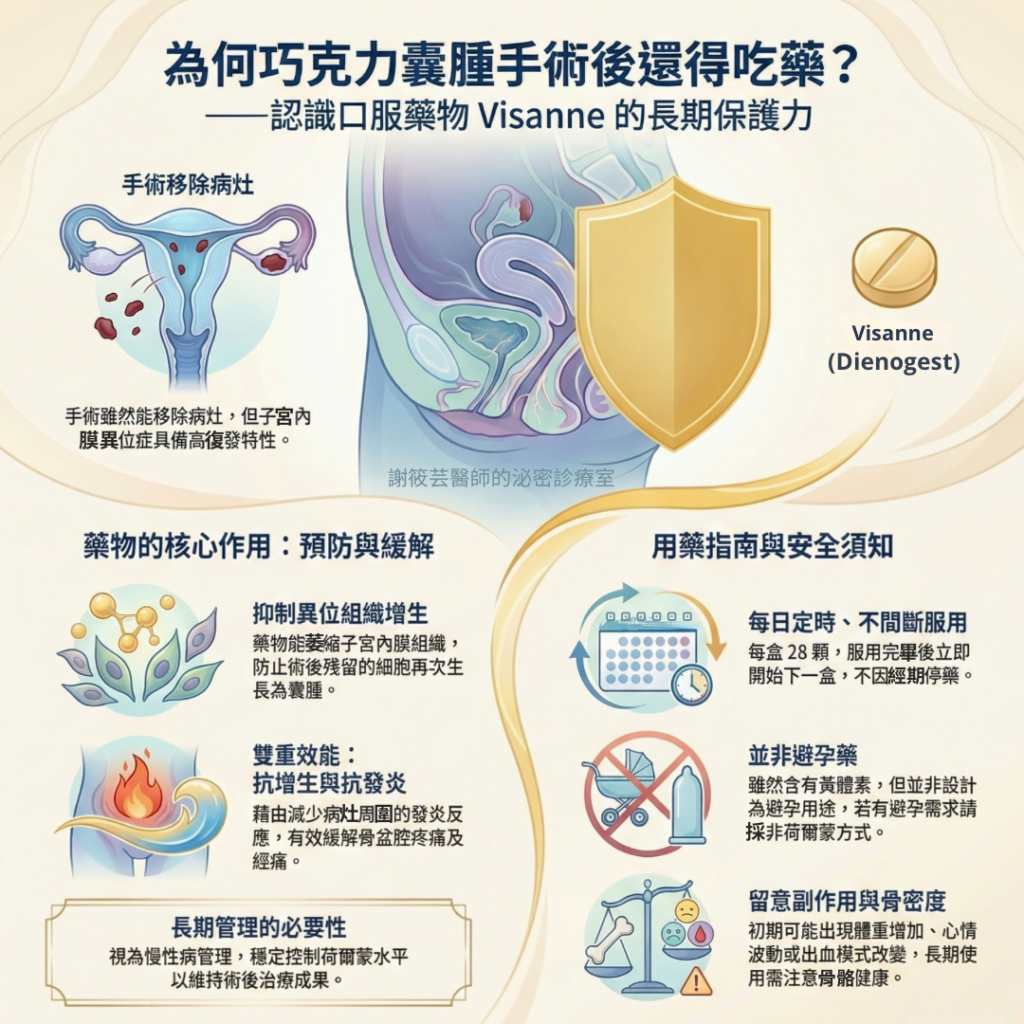 很多患者在術後回診時會問我:「謝醫師,既然手術已經把巧克力囊腫切除了,子宮肌腺症也處理了,為什麼還要每天吃藥,不能就此『收工』嗎?」