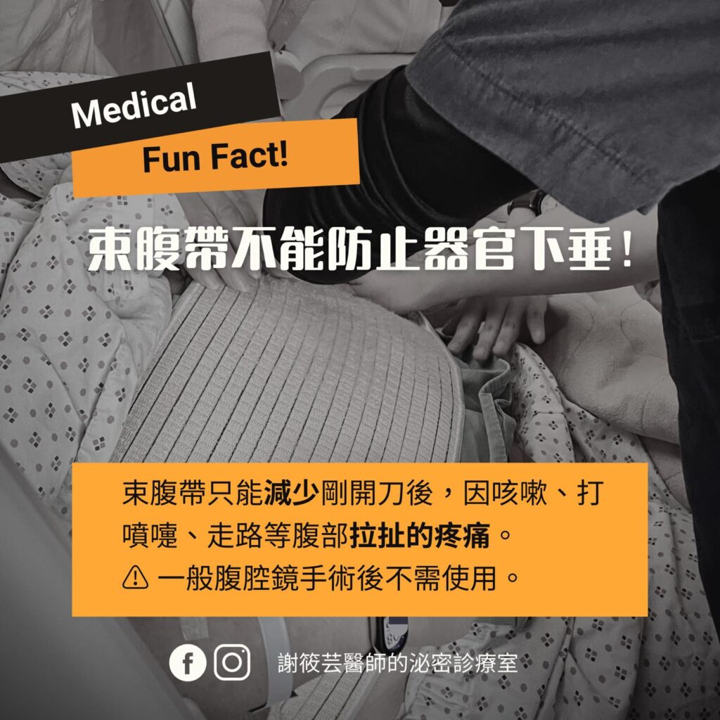 傳統剖腹傷口可以考慮,尤其是婦癌手術傷口較大,束腹帶可能減少活動時的疼痛感。