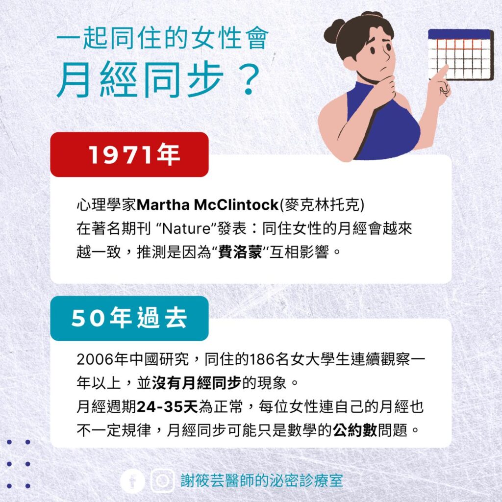 五十年過去,大多數專家的共識是 -「月經同步只是個迷思」。
