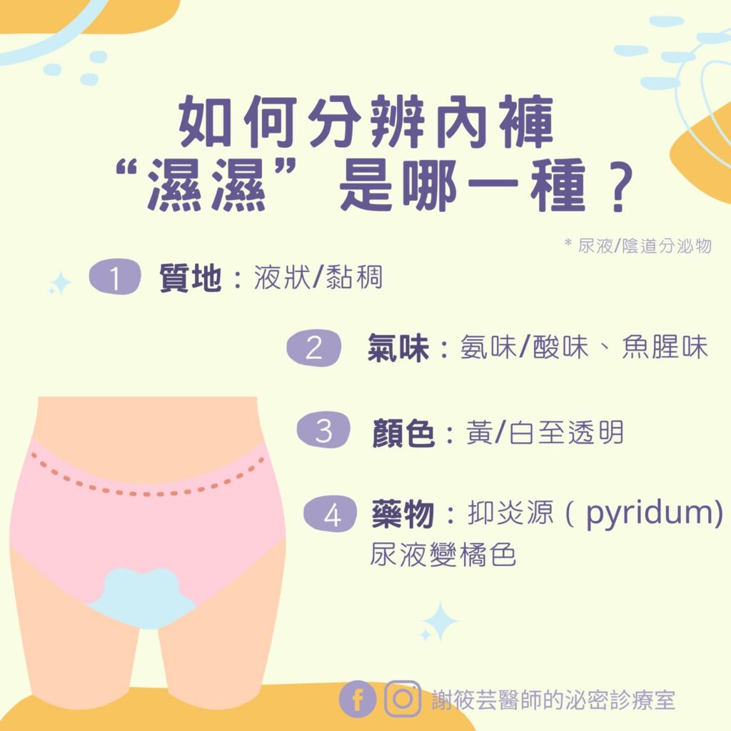- 尿液呈淡黃色,而陰道分泌物呈白色或透明