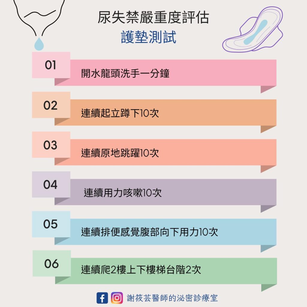 參考資料:Flisser AJ, Figueroa J, Bleustein CB, Panagopoulos G, Blaivas JG. Pad test by mail for home evaluation of urinary incontinence. Neurourol Urodyn. 2004;23(2):127-129.