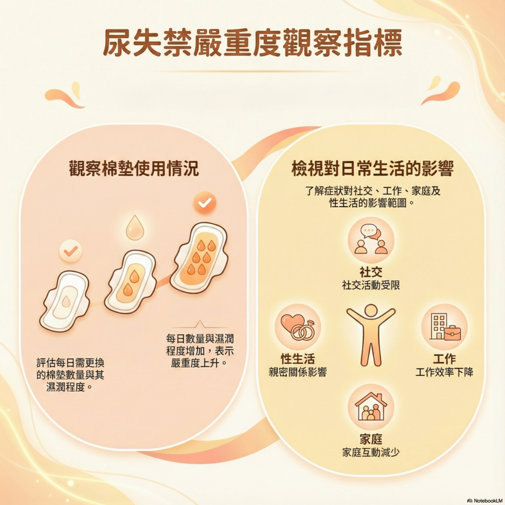 尿失禁的嚴重度可由兩個方式觀察:
