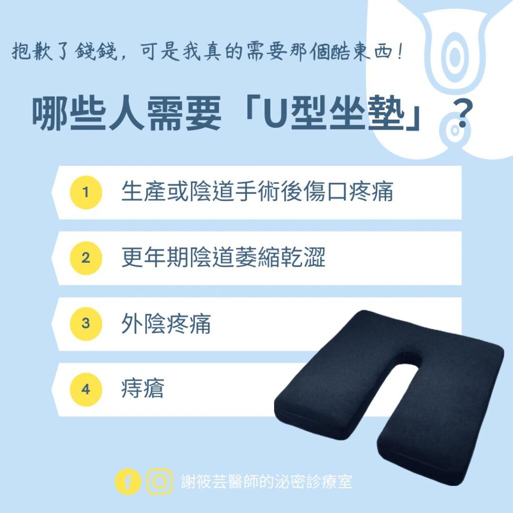 生活中還可以使用圖中的U型坐墊 ,適合久坐時陰部神經肌肉緊繃的婦女。它中空的部分剛好避開椅子對會陰的壓迫,可在坐著或開車時透過提升骨盆底肌肉來緩解不適。