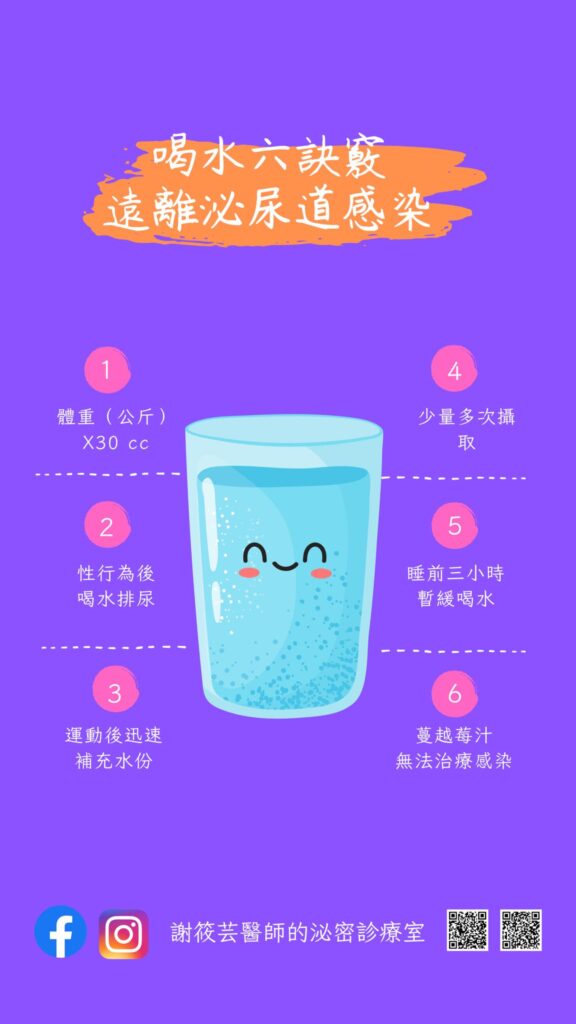 ❷ 性行為常是導致女生膀胱尿道炎的主因,甚至有反覆感染的患者對「性行為」感到恐懼,每次行房後的血尿疼痛讓她痛不欲生,還都得找我拿抗生素治療。自從注意性行為前後喝300cc的水,完事後把尿液排空並清洗外陰,從此以後我們在診間見面的次數就減少很多了呢😊